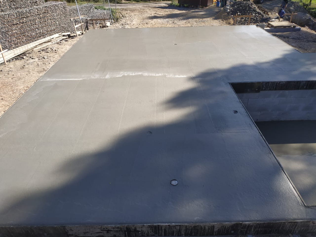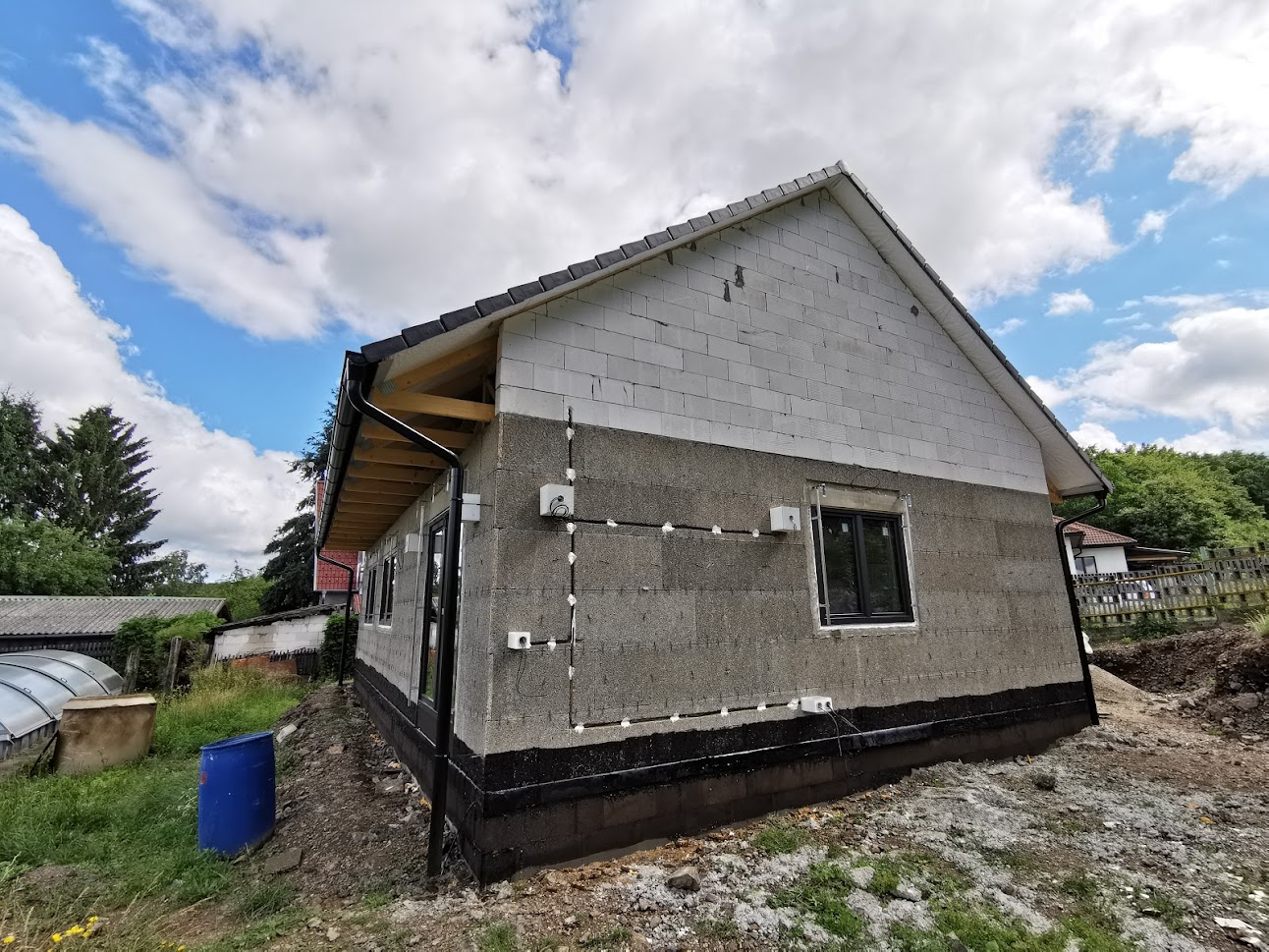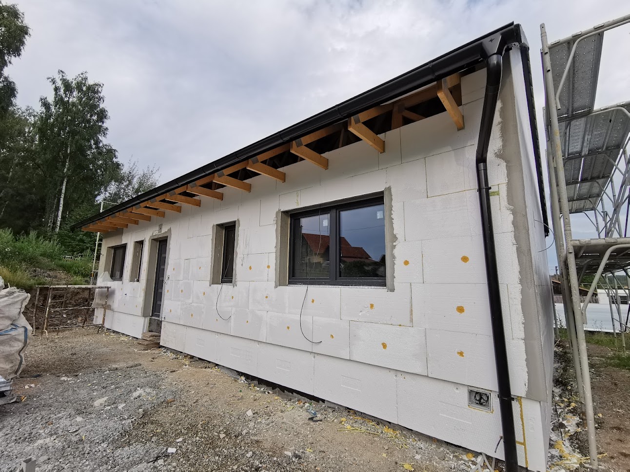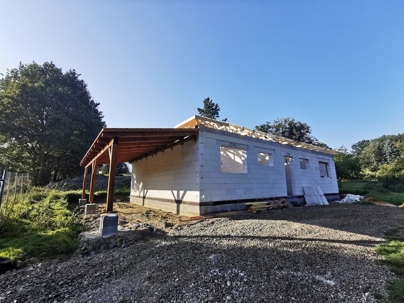 Hrubá stavba byla realizována na klíč. Základová deska obsahuje odvětrání proti radonu, které se pomalu, ale jistě stává nezbytnou součástí každého nízkoenergetického domu s podlahovým vytápěním. Zdivo je z vápenopískových cihel, krov příhradový s možností vyžití podkroví jako skladových prostor s klasickou skládanou malo-formátovou krytinou.