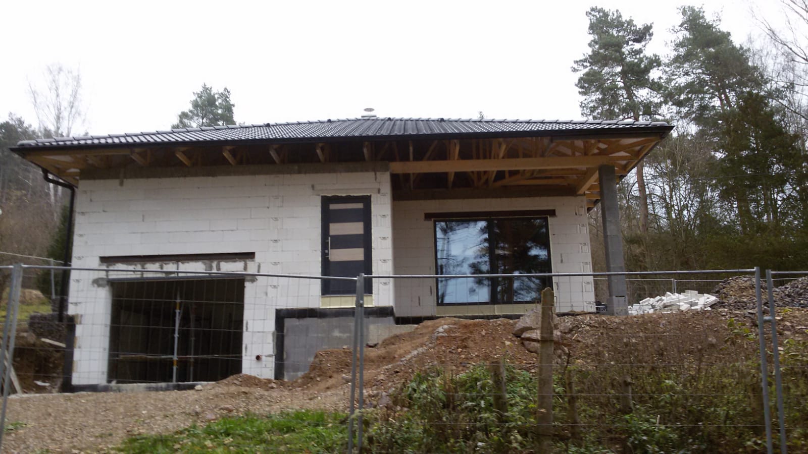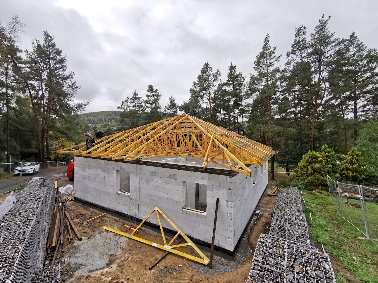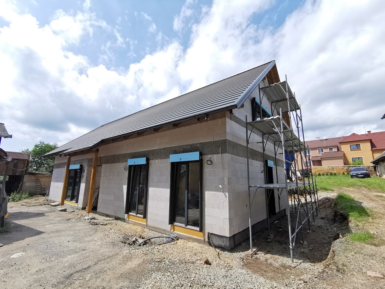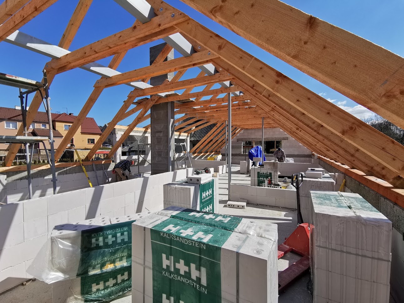 Hrubá stavba byla realizována na klíč. Základová deska obsahuje odvětrání proti radonu, které se pomalu, ale jistě stává nezbytnou součástí každého nízkoenergetického domu s podlahovým vytápěním. Zdivo je z vápenopískových cihel, krov příhradový s možností vyžití podkroví jako skladových prostor s klasickou skládanou malo-formátovou krytinou.