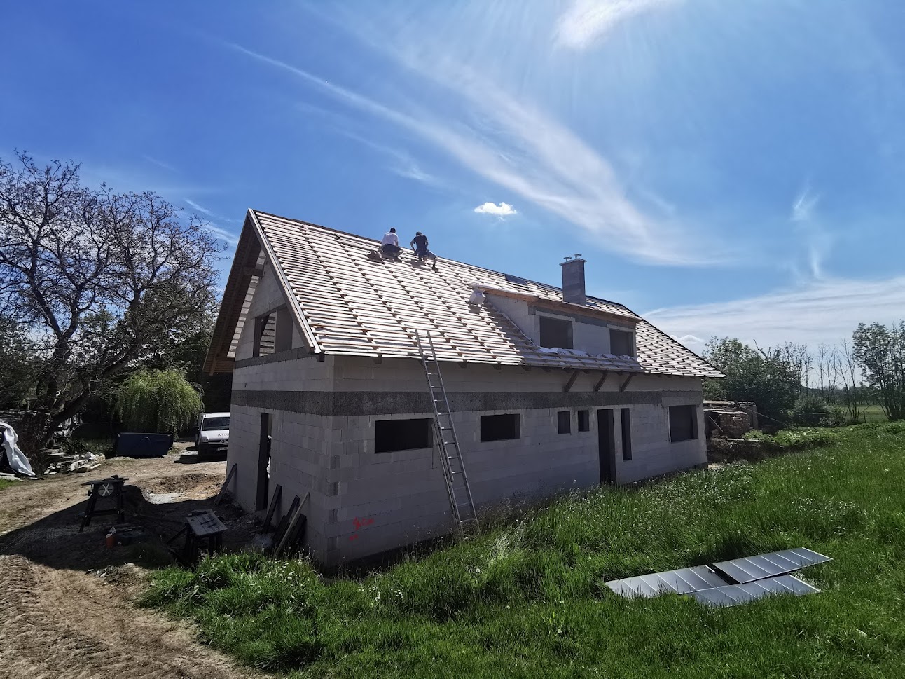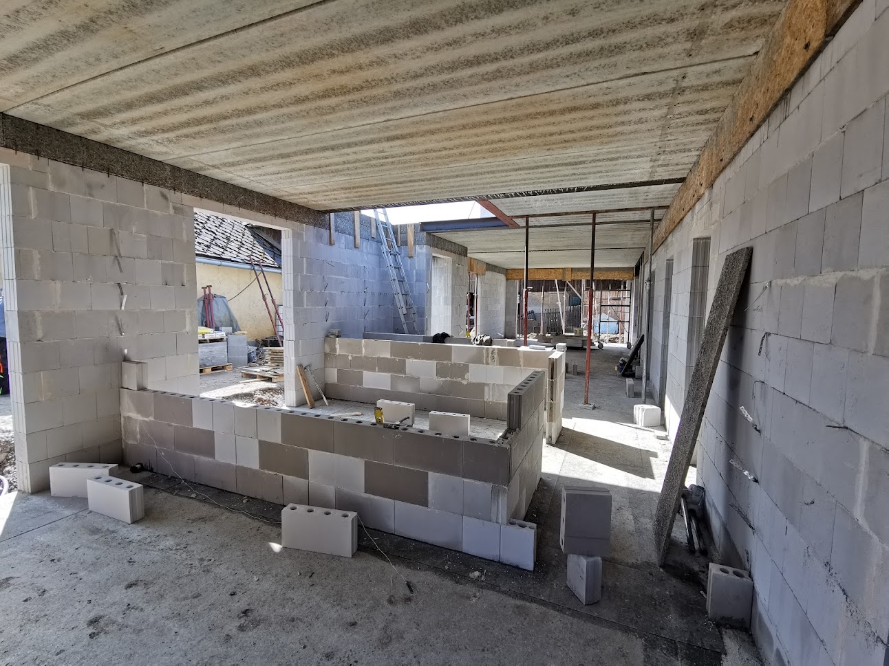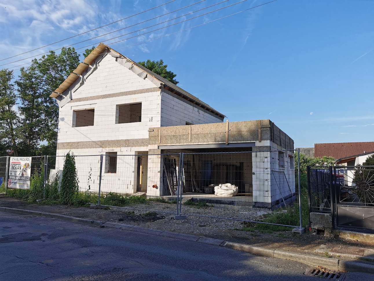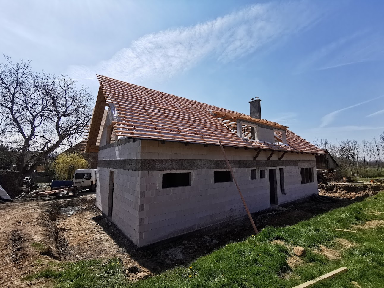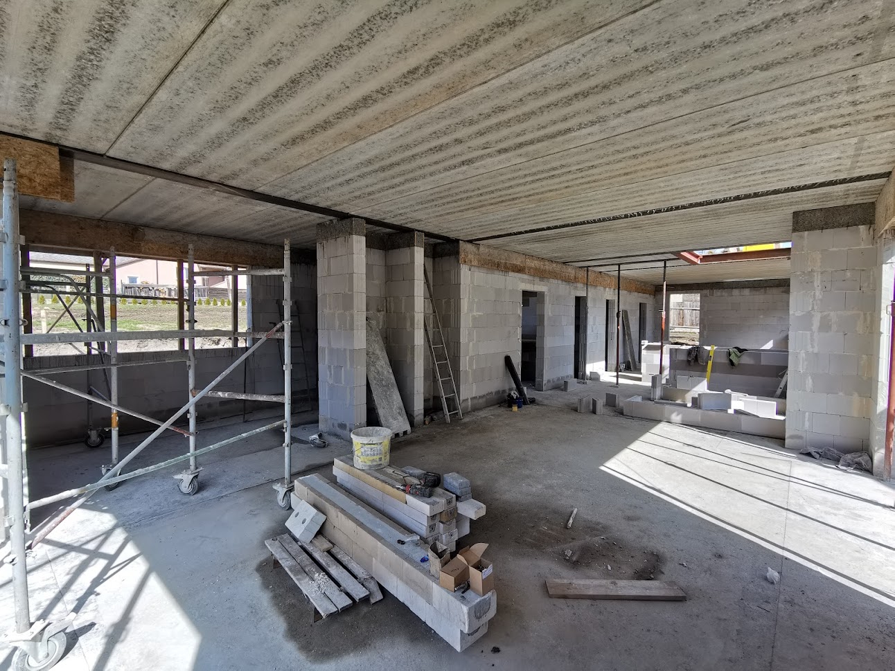 Hrubá stavba byla realizována na klíč. Základová deska obsahuje odvětrání proti radonu, které se pomalu, ale jistě stává nezbytnou součástí každého nízkoenergetického domu s podlahovým vytápěním. Zdivo je z vápenopískových cihel, krov příhradový s možností vyžití podkroví jako skladových prostor s klasickou skládanou malo-formátovou krytinou.