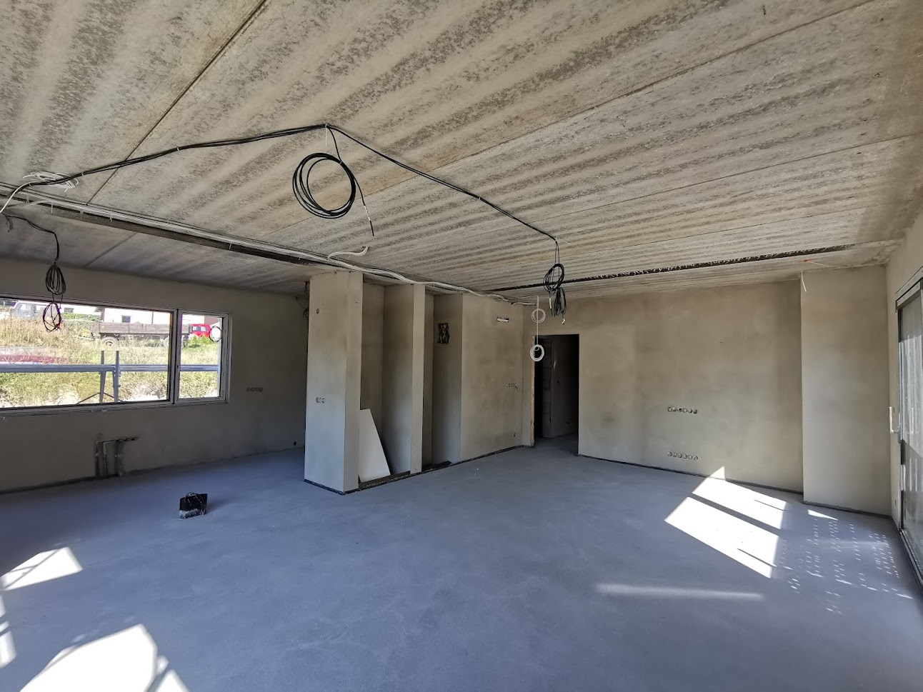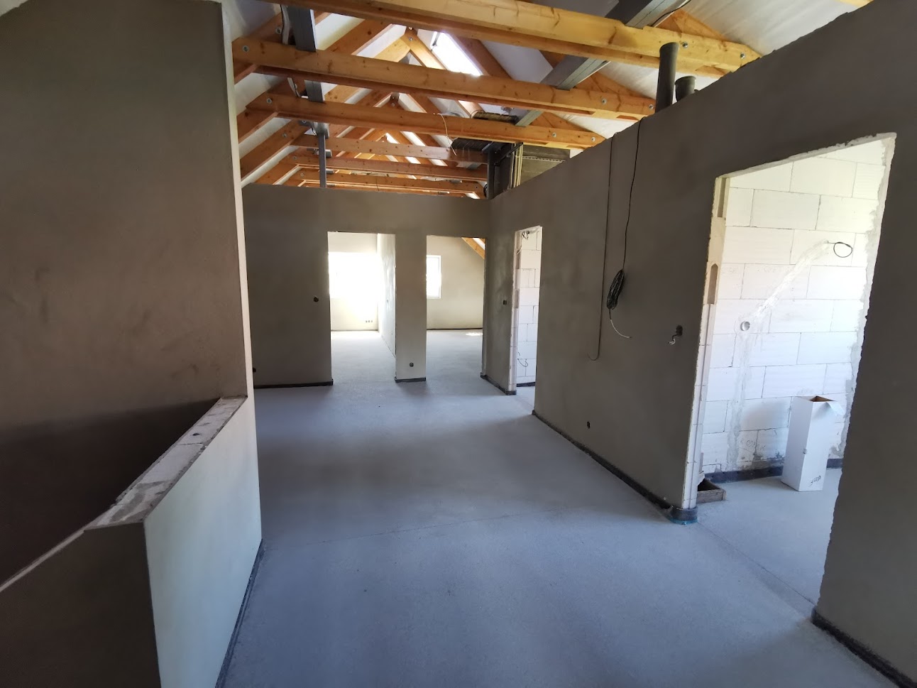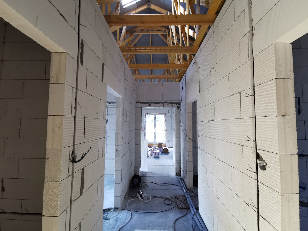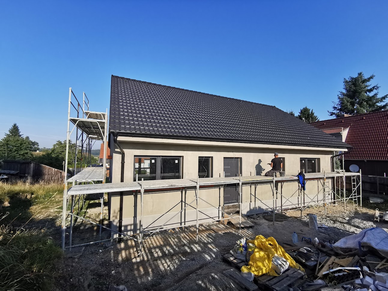 Hrubá stavba byla realizována na klíč. Základová deska obsahuje odvětrání proti radonu, které se pomalu, ale jistě stává nezbytnou součástí každého nízkoenergetického domu s podlahovým vytápěním. Zdivo je z vápenopískových cihel, krov příhradový s možností vyžití podkroví jako skladových prostor s klasickou skládanou malo-formátovou krytinou.