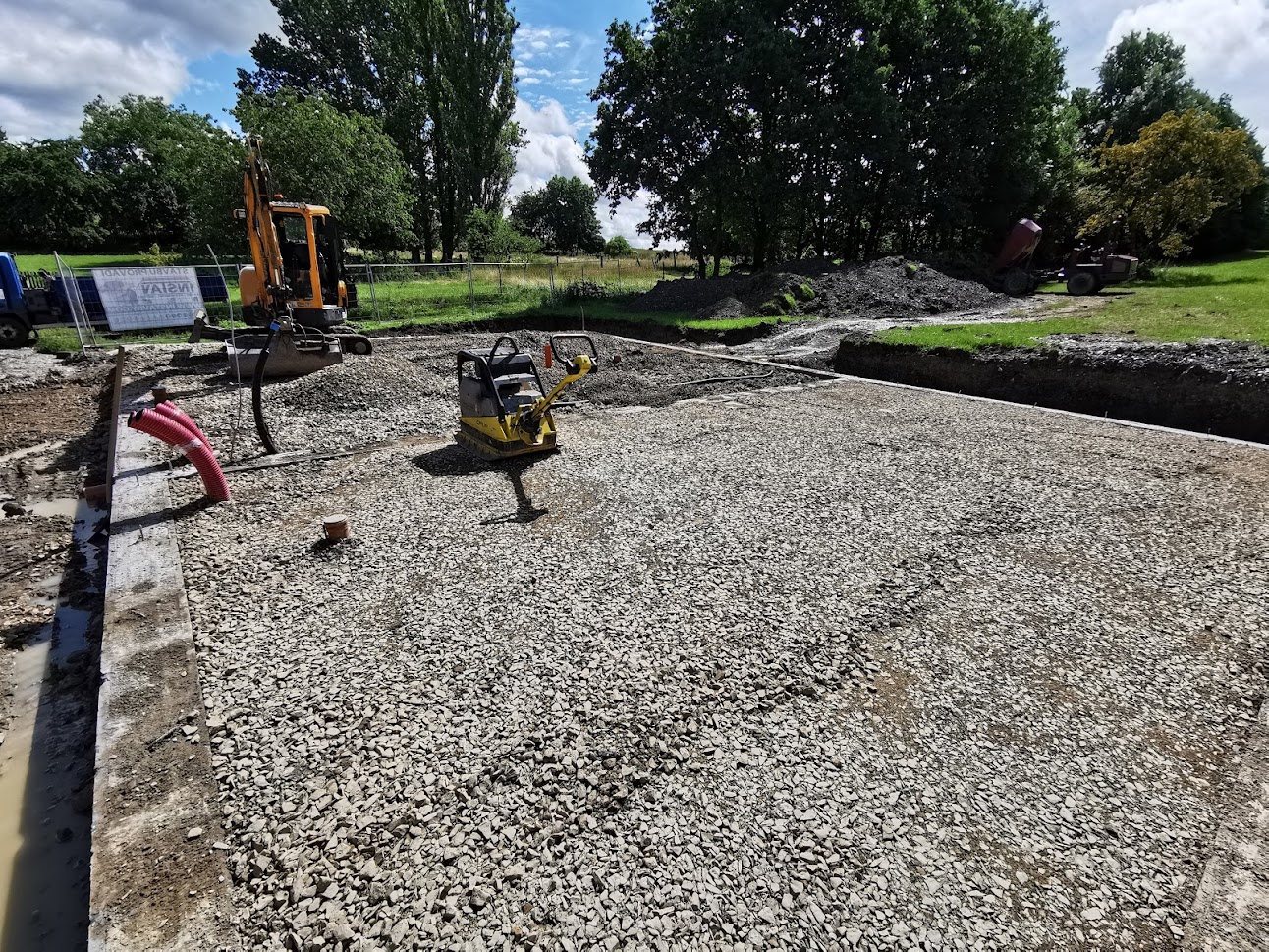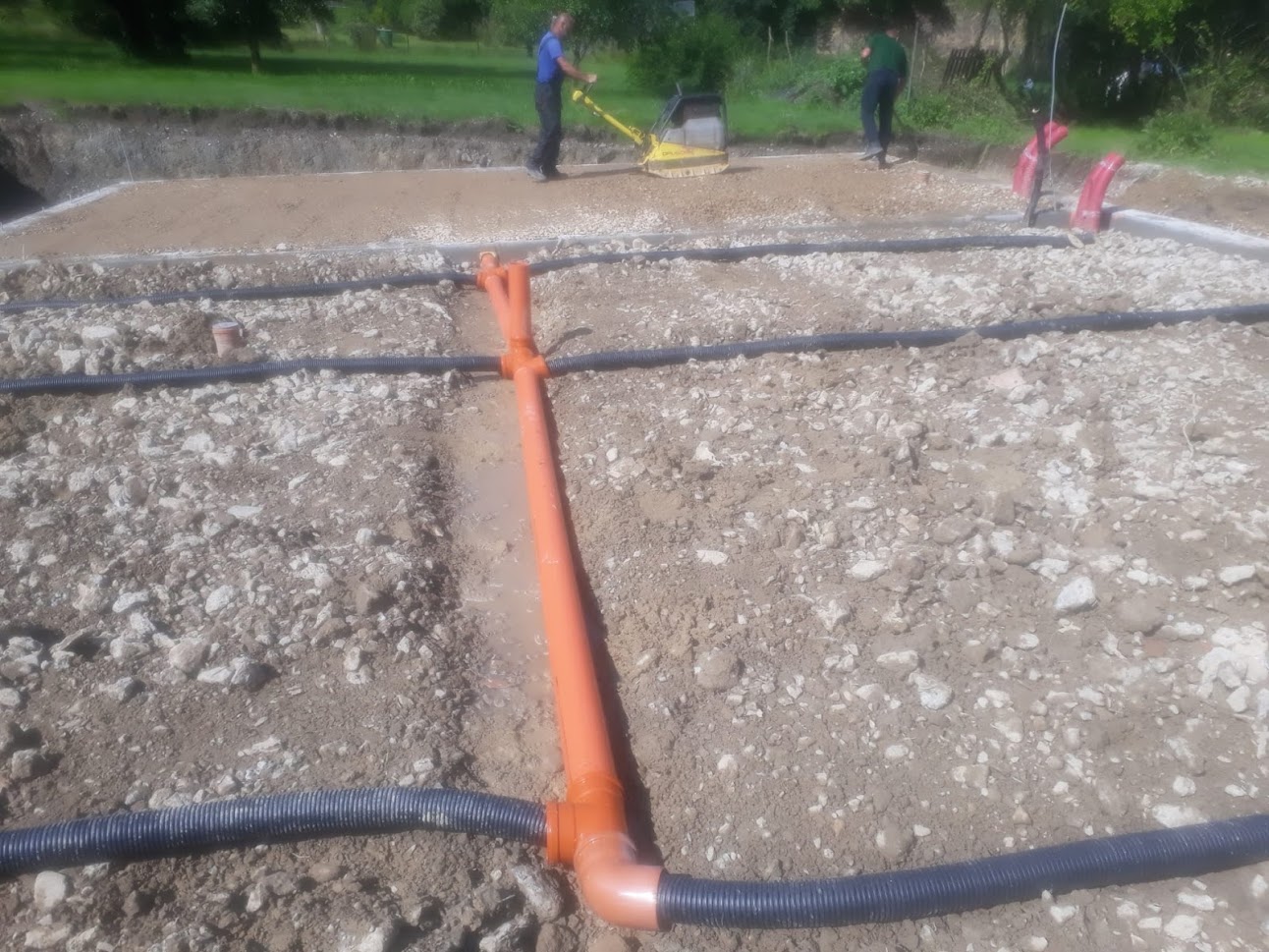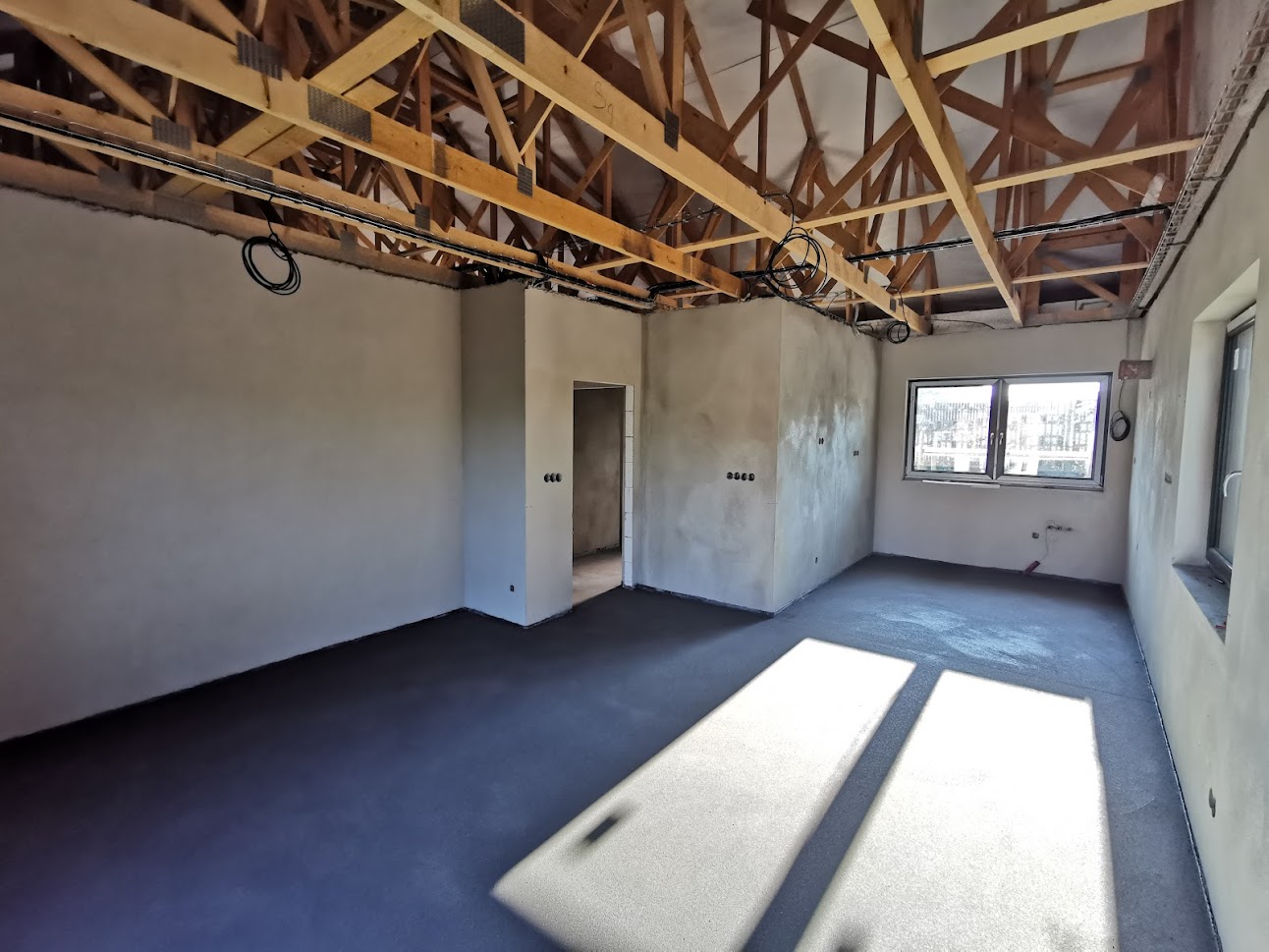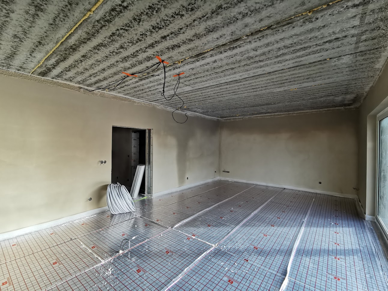 Hrubá stavba byla realizována na klíč. Základová deska obsahuje odvětrání proti radonu, které se pomalu, ale jistě stává nezbytnou součástí každého nízkoenergetického domu s podlahovým vytápěním. Zdivo je z vápenopískových cihel, krov příhradový s možností vyžití podkroví jako skladových prostor s klasickou skládanou malo-formátovou krytinou.