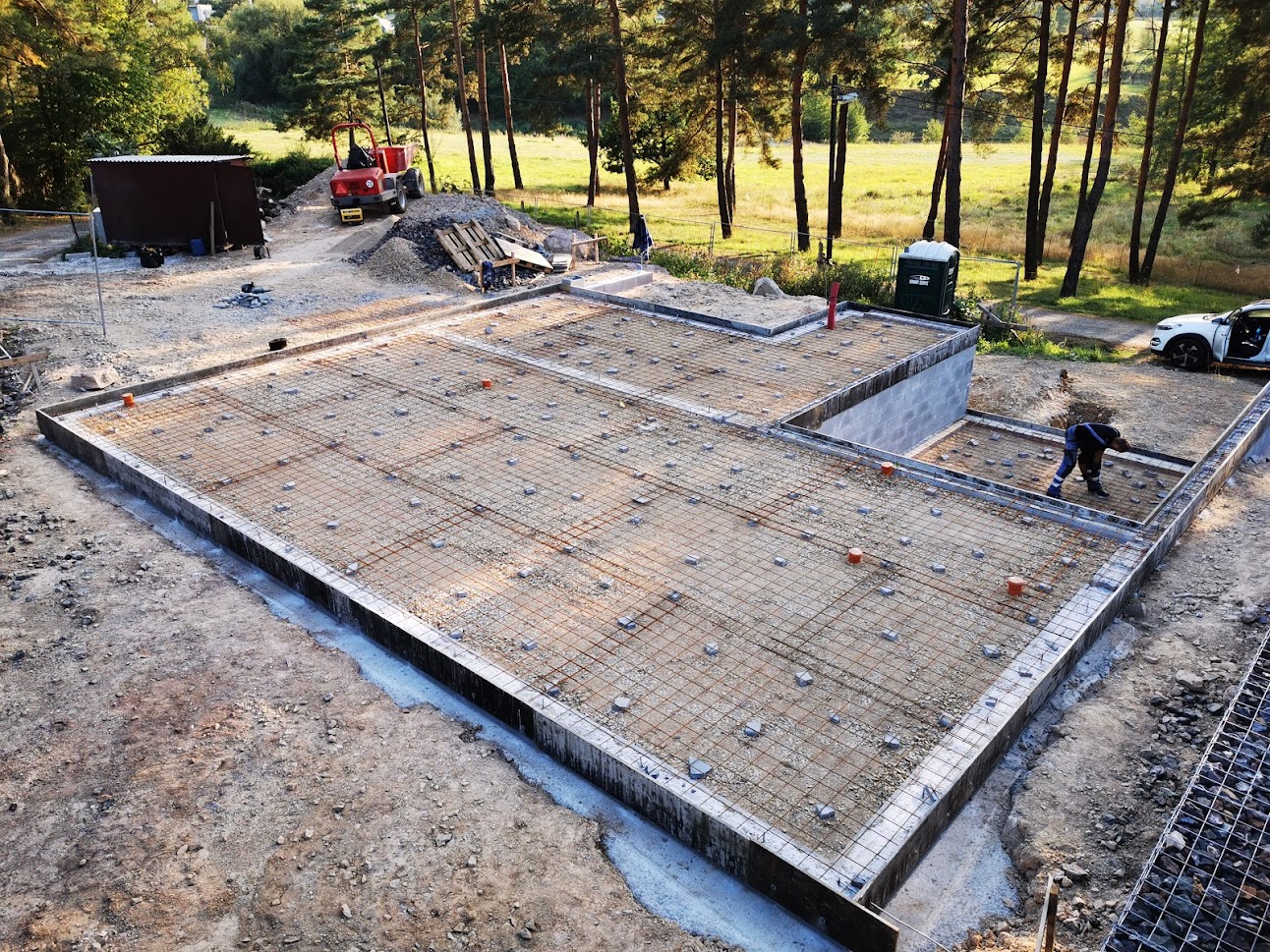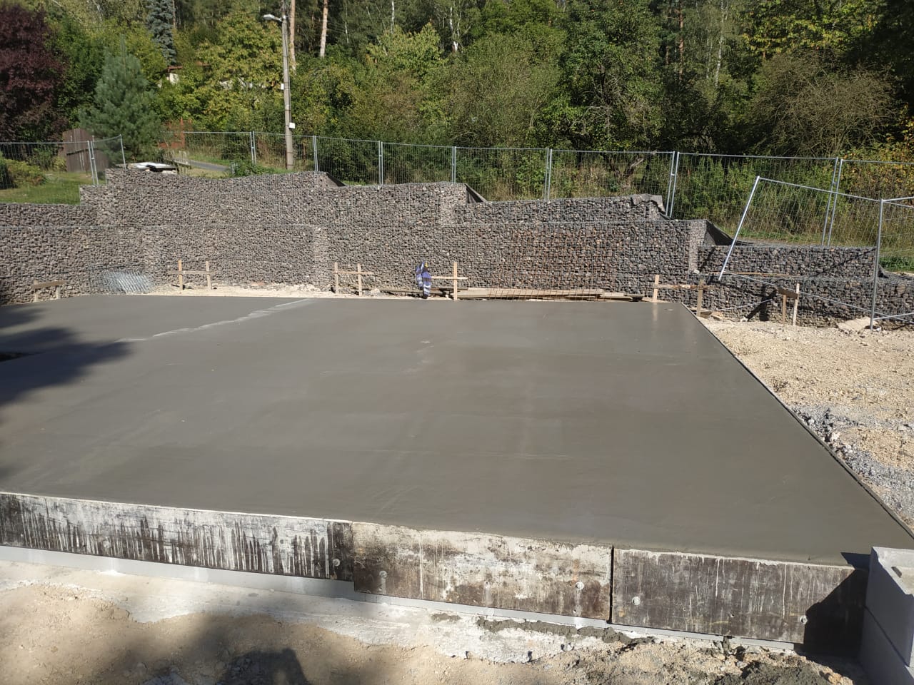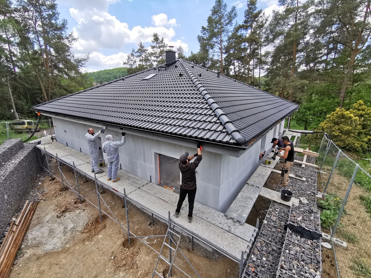 Některé rodinné domy mají výjimečné umístění v krásné přírodě, to si někdy žádá i výjimečná řešení. Pro tento dům jsme nejprve realizaci 3,5m opěrné gabionové stěny a poté se pustili do samotné výstavby. Dům má dvě úrovně, samostatně přístupnou garáž zapuštěnou do terénu a výše umístěný dům. Realizace probíhala na etapy a postupnými kroky jsme se dostali k celkovému dokončení stavby včetně okolních chodníků a plotu.