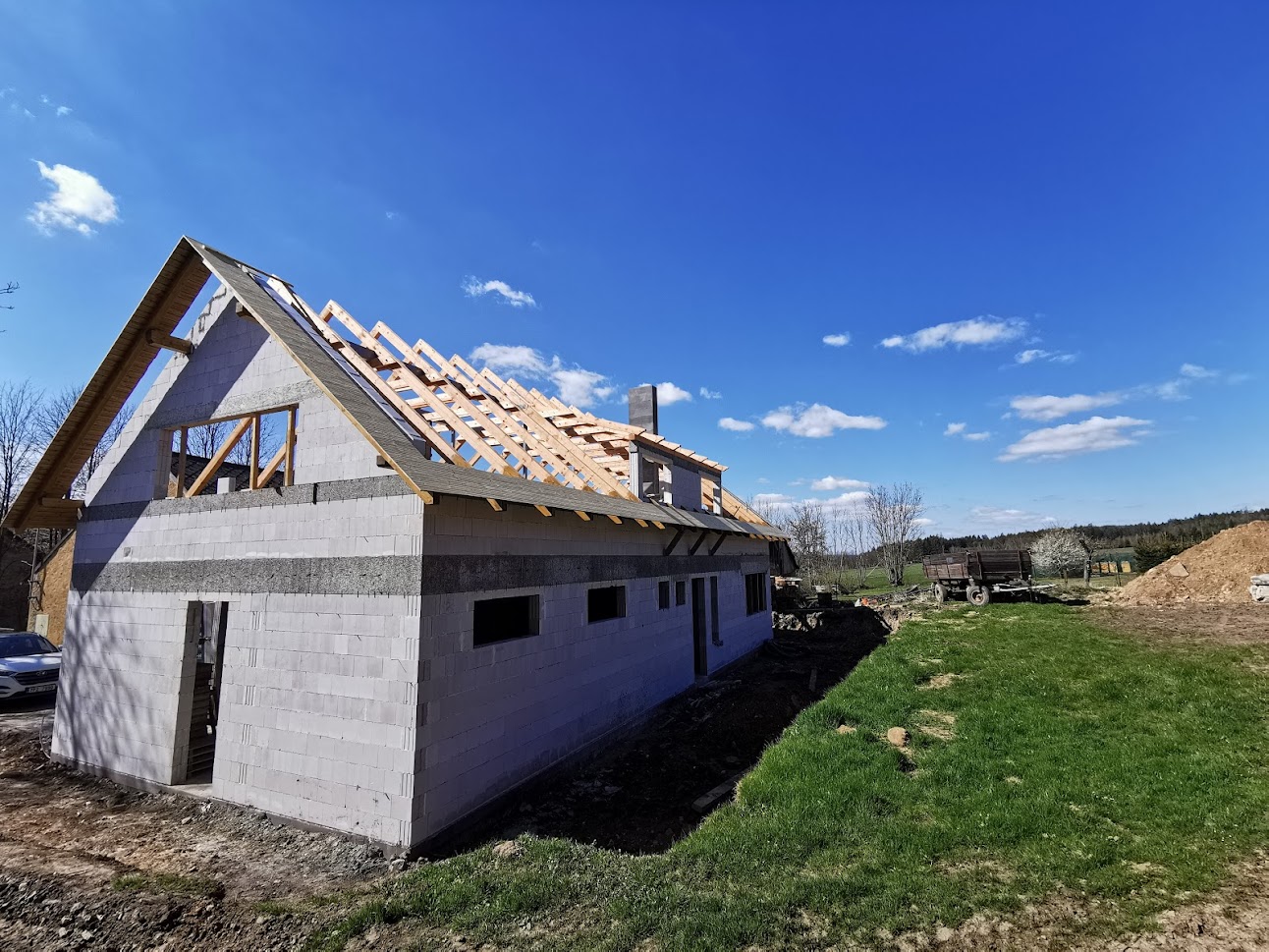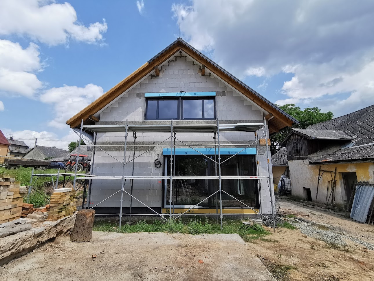 Prolínání moderního stylu s tradičními tvary. Takto by se dal popsat tento dům, který má sedlovou střechu bez přesahů štítů s navazující plochou střechou garáže. Mnoho obcí v našem regionu nemá ucelený územní plán, tak aby nedocházelo k módním výstřelkům. Je dobře když stavitelé myslí nejenom na svoje tužby, ale také na okolní zástavbu a celkový dojem domu vzhledem k jeho umístění. Pro zákazníka jsme zhotovili kompletní hrubou stavbu na klíč. Majitele si sami vyřešili instalatéry a po jejich práci jsme se dále podíleli na dokončení domu strojními omítkami, podlahami a přípojkami.